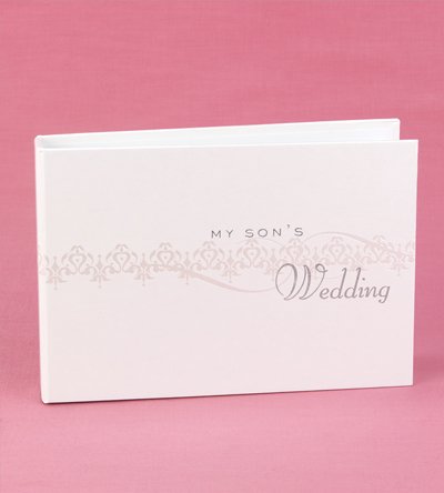 White photo album. Pearlescent design. My Son's Wedding - printed in silver. Album holds 48, 6 x 4 inches photos inside. Measures 7 x 4.75 inches